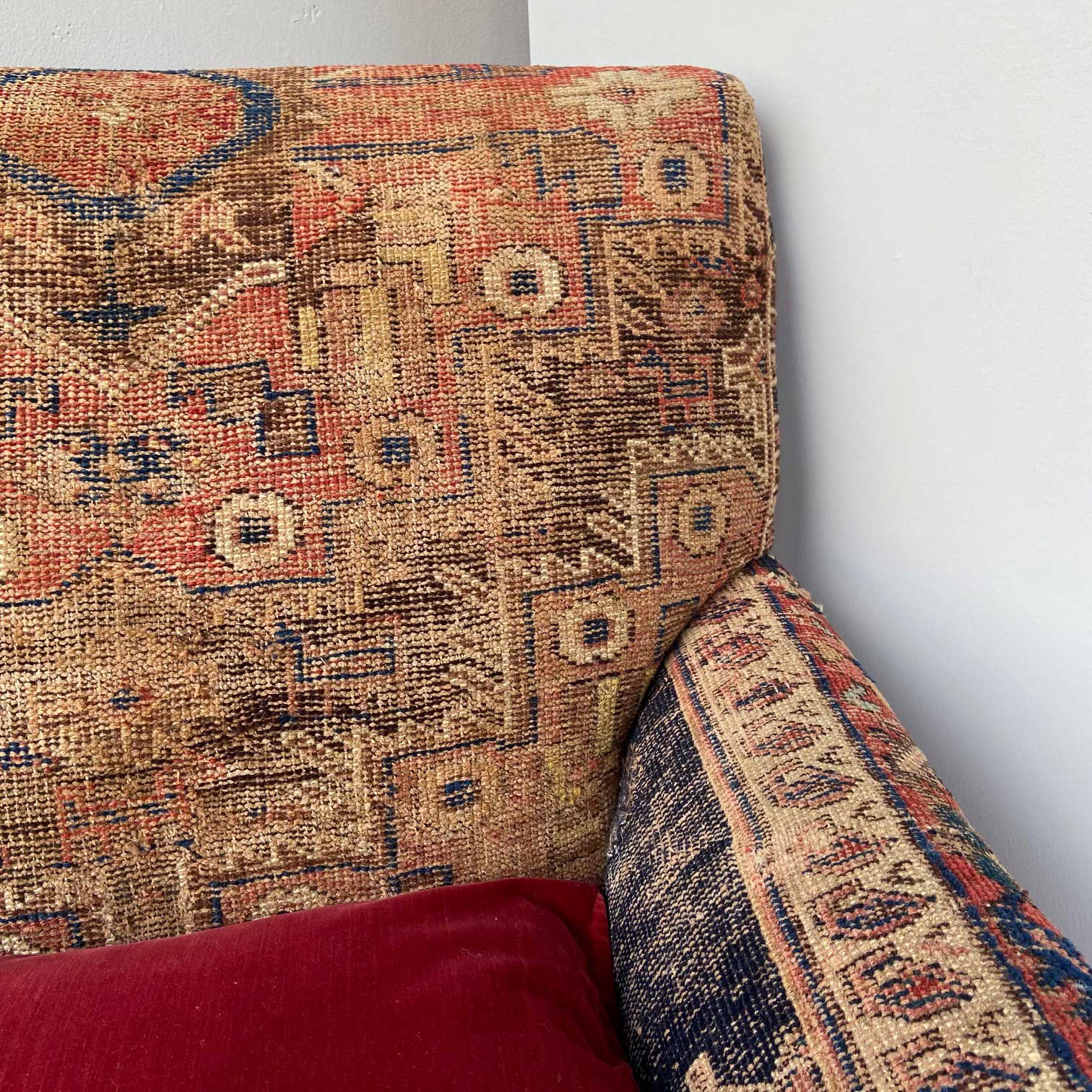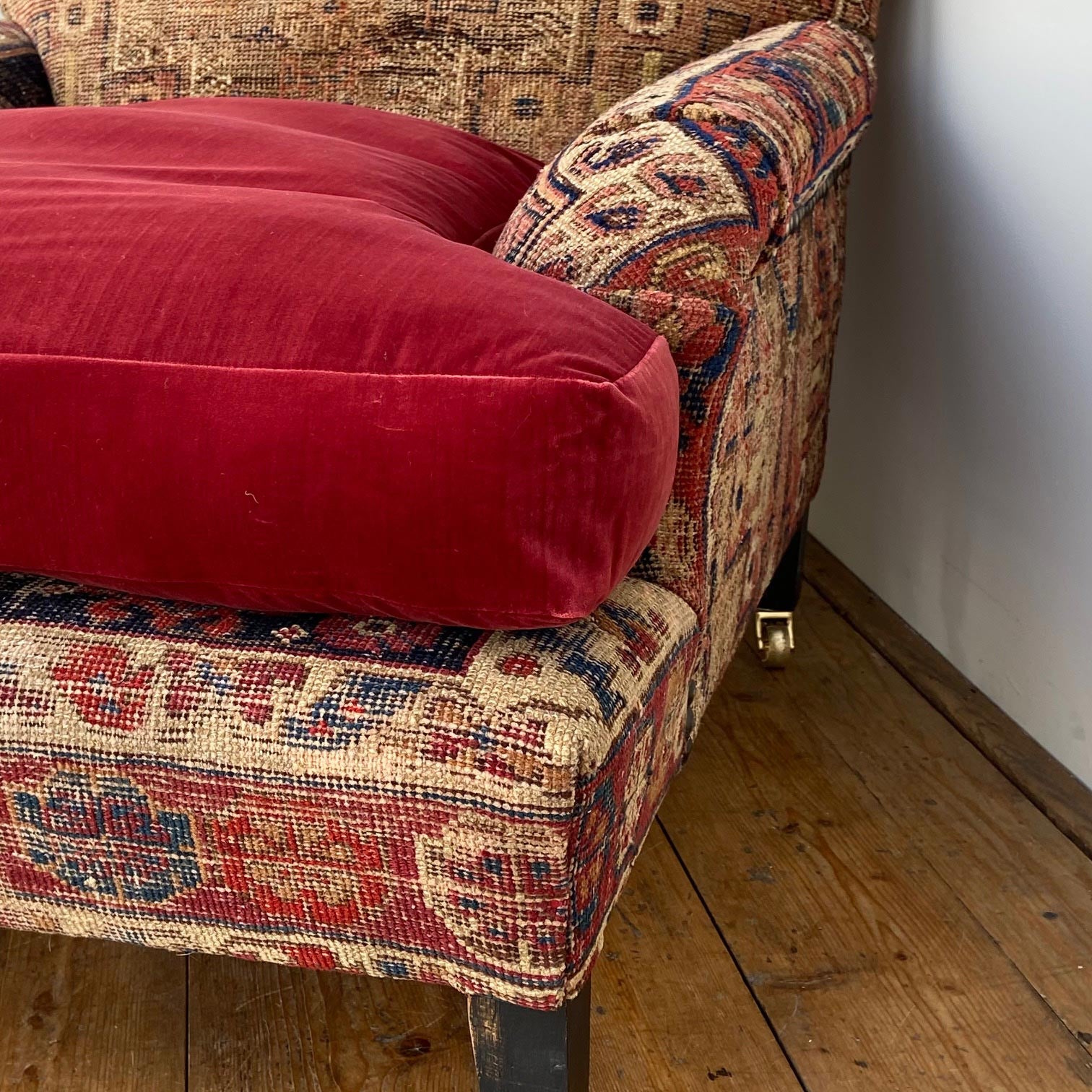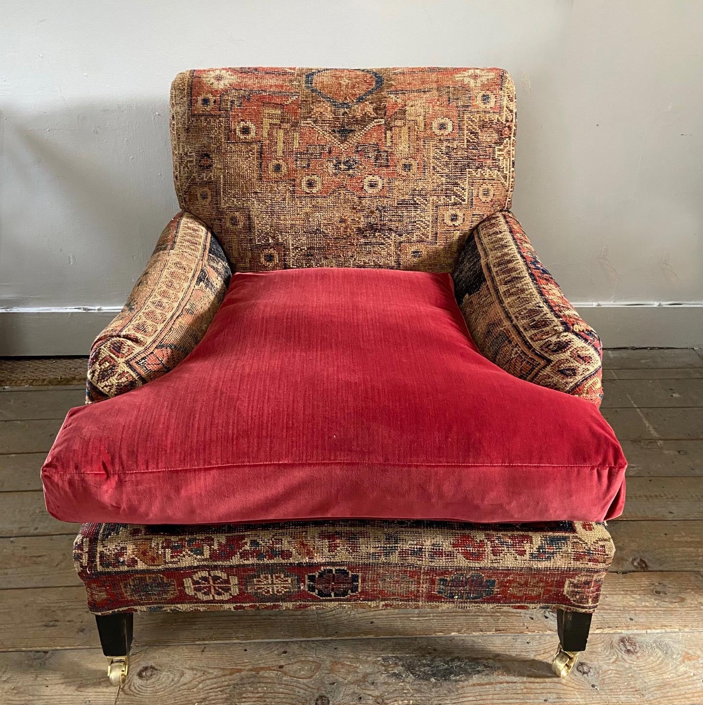 A wonderfully faded carpet chair, generous size with a great worn look. New velvet cushion