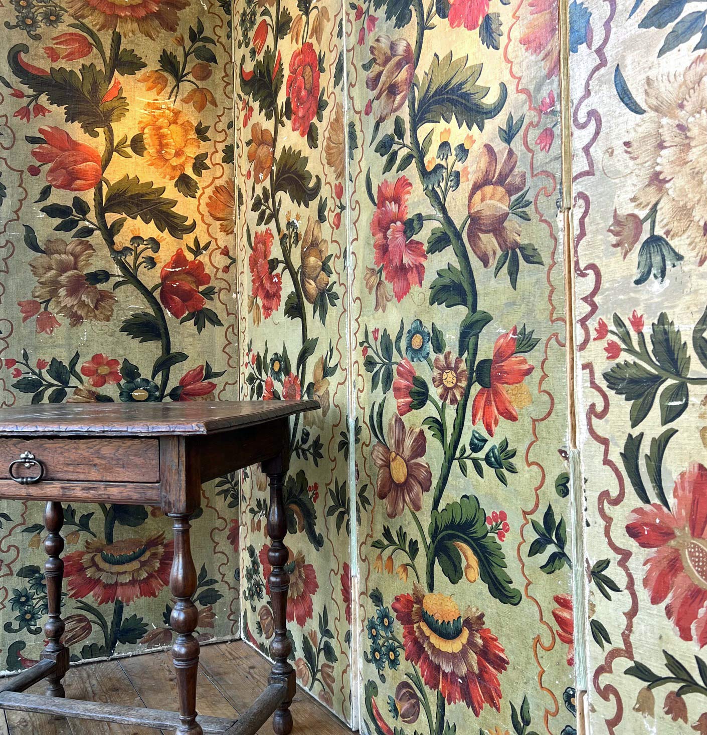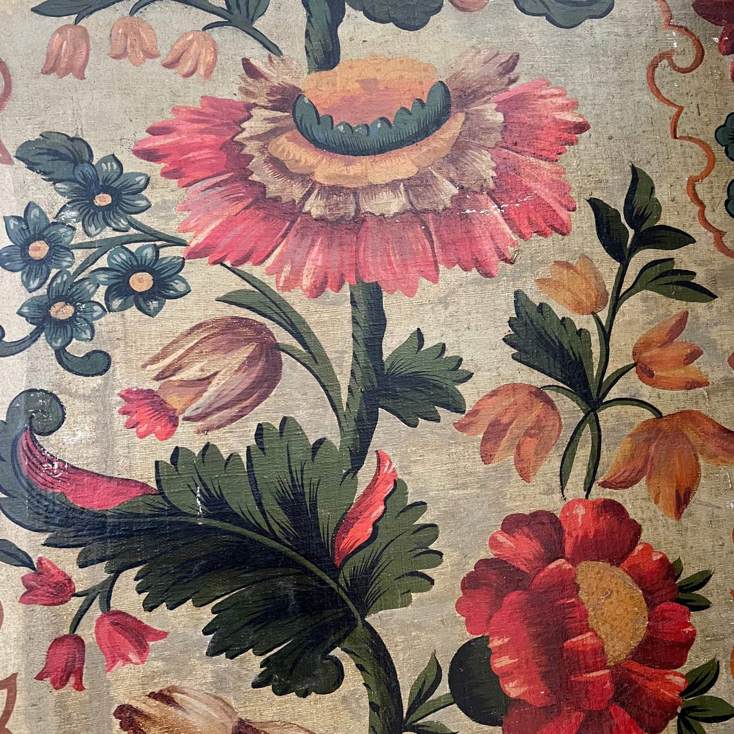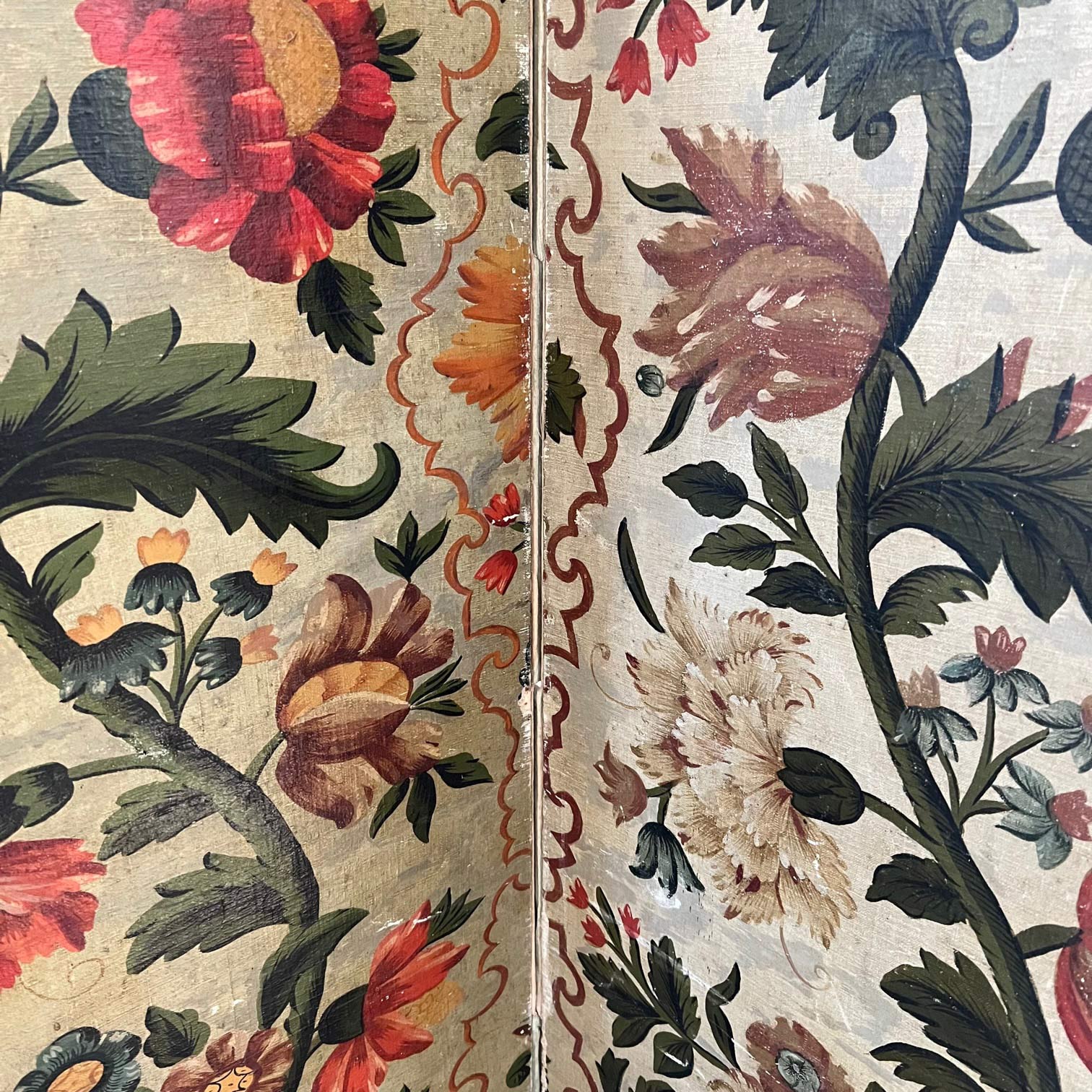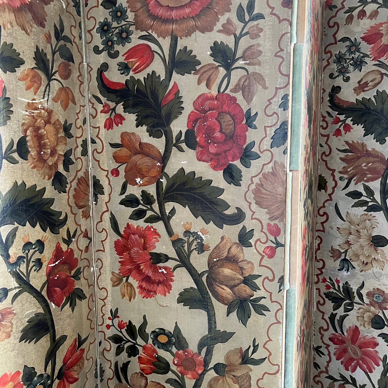 A magnificent 19thC four fold screen with bold hand painted decoration. In great condition for it's age and still displaying bright colours.