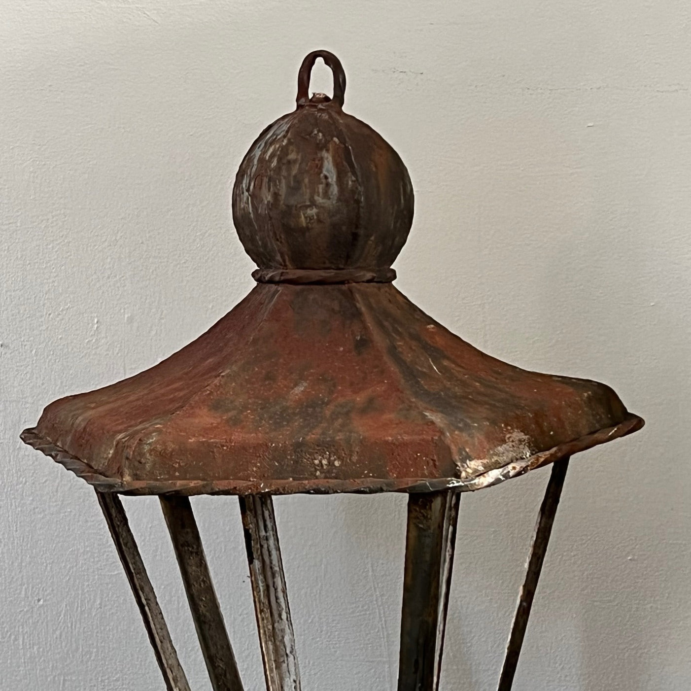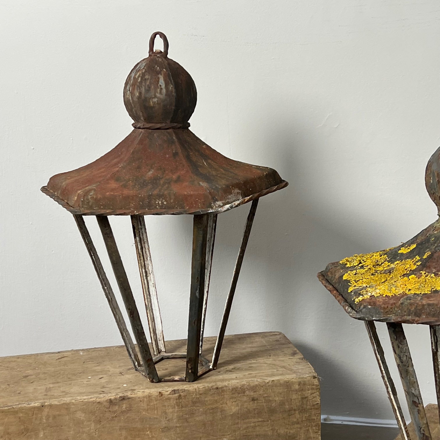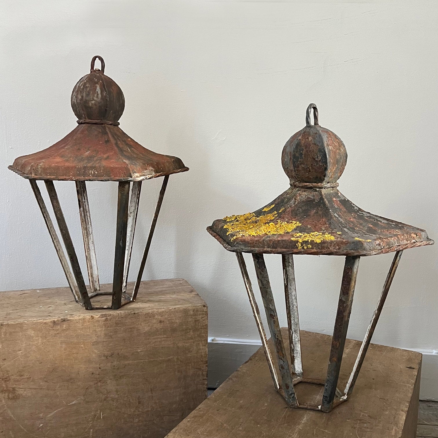A pair of charming tole lanterns with a pagoda shape to the tops. Retaining lots of natural patina. Rewired and PAT tested