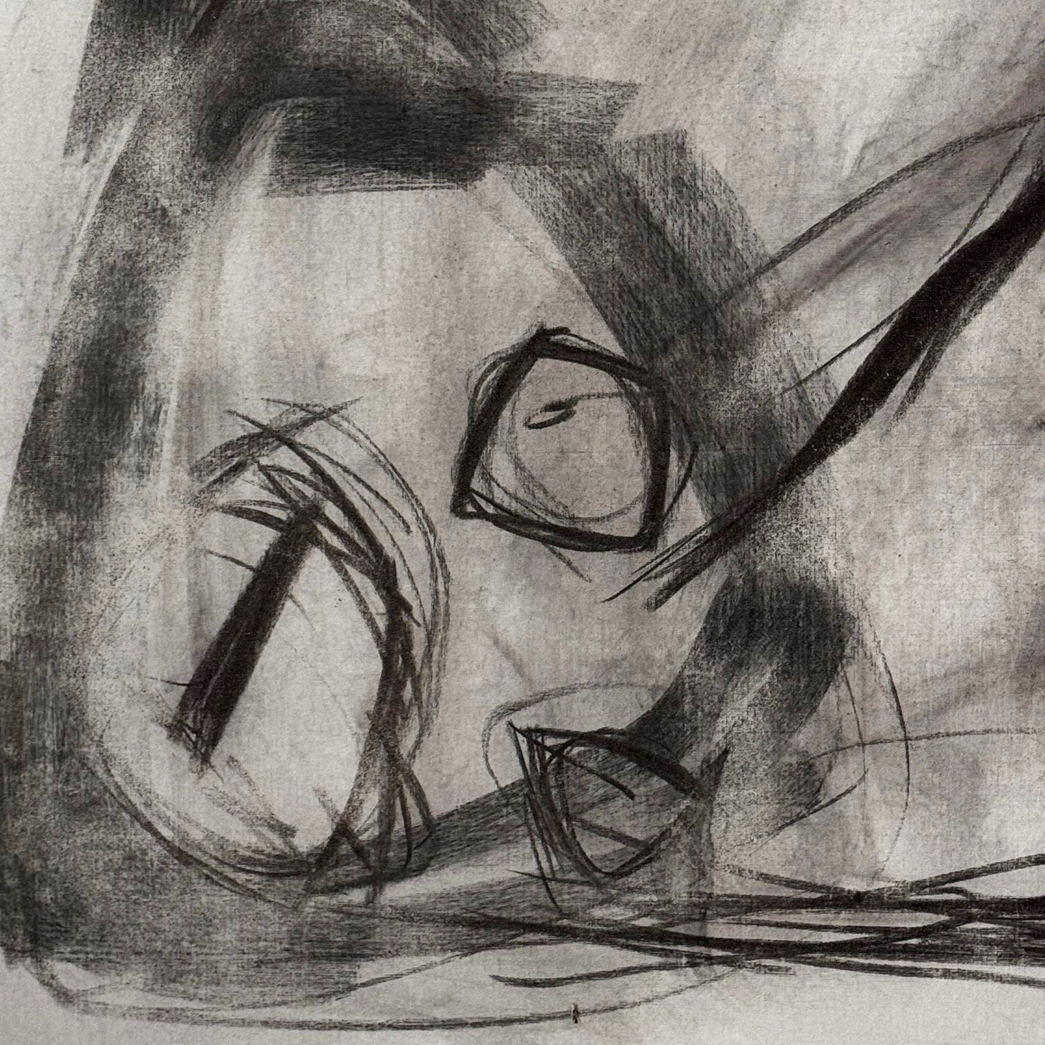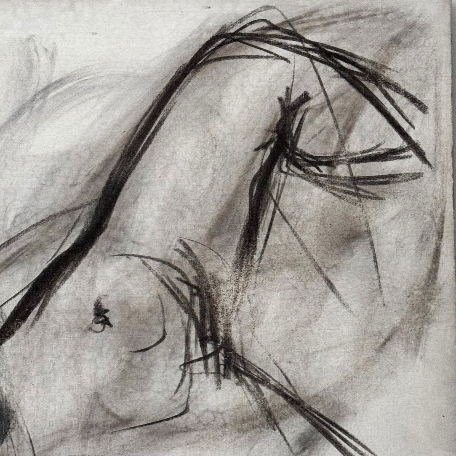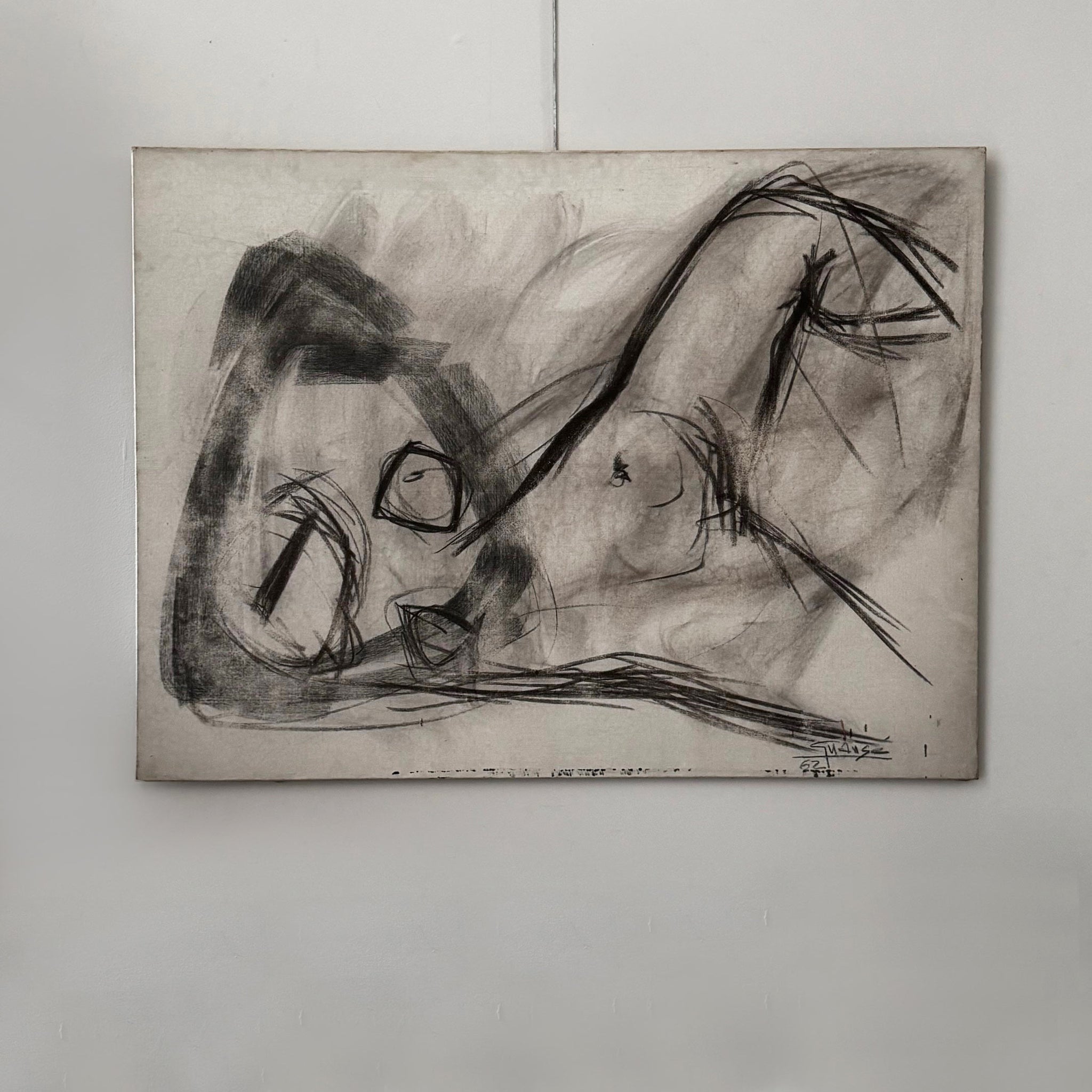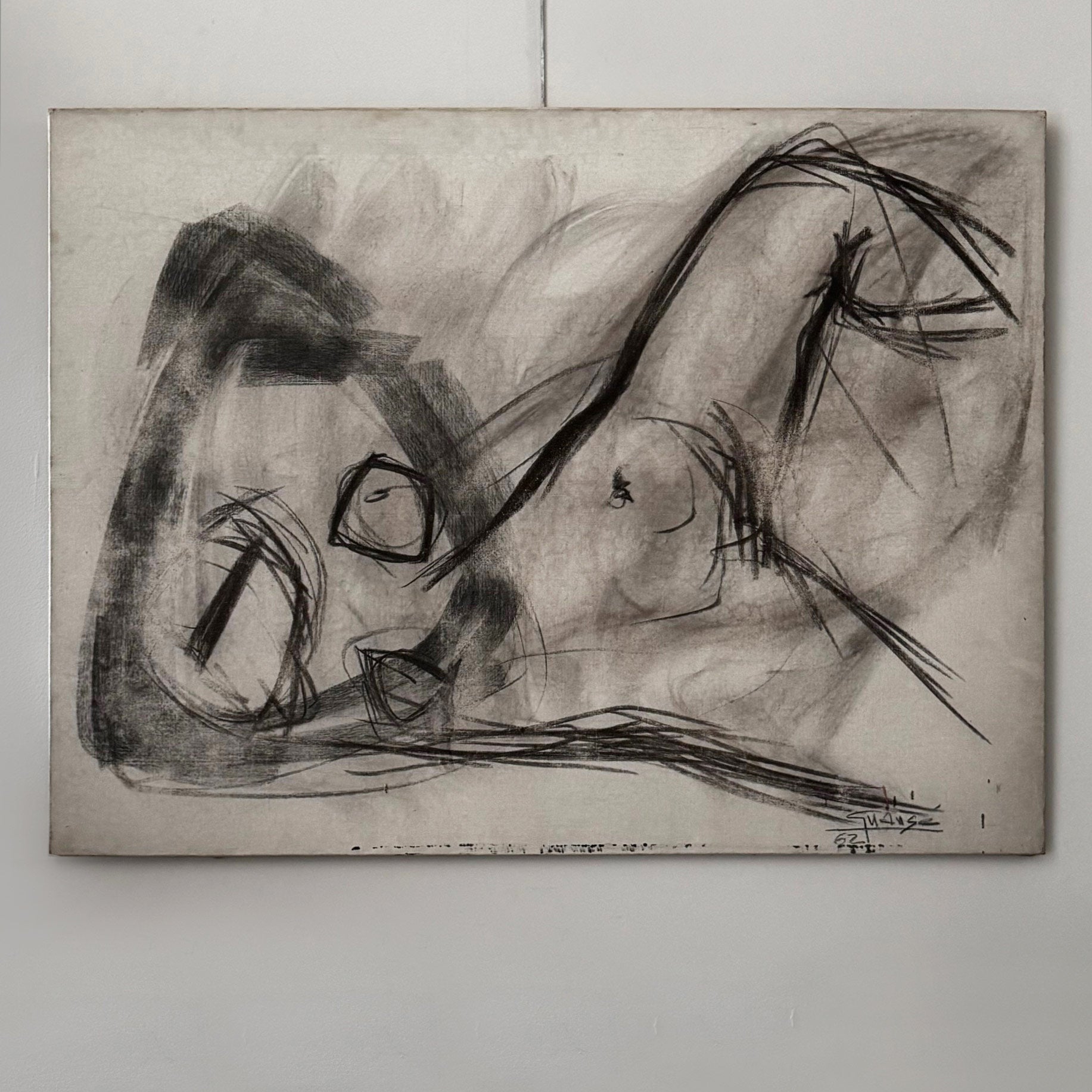 A dynamic monochrome painting of a nude. Chalk on canvas. Indistinctly signed, dated 1962