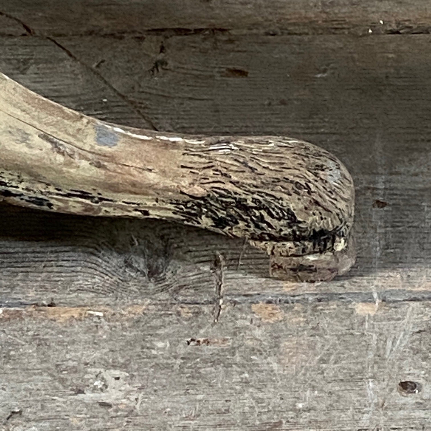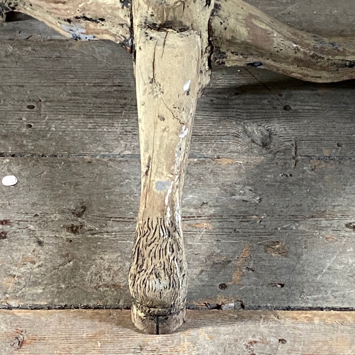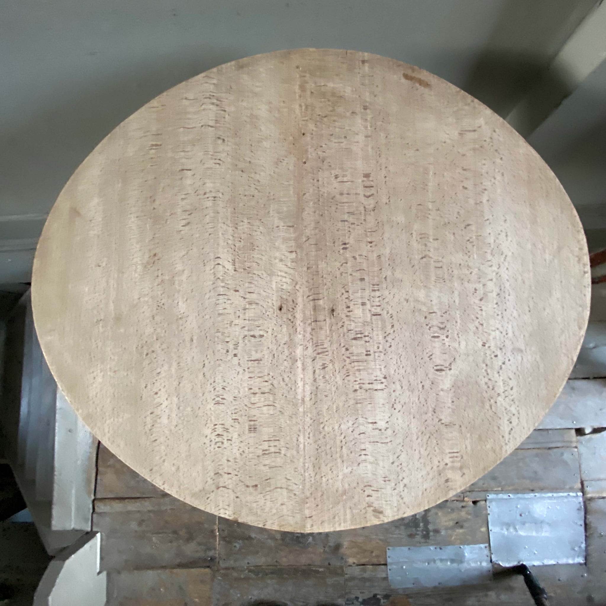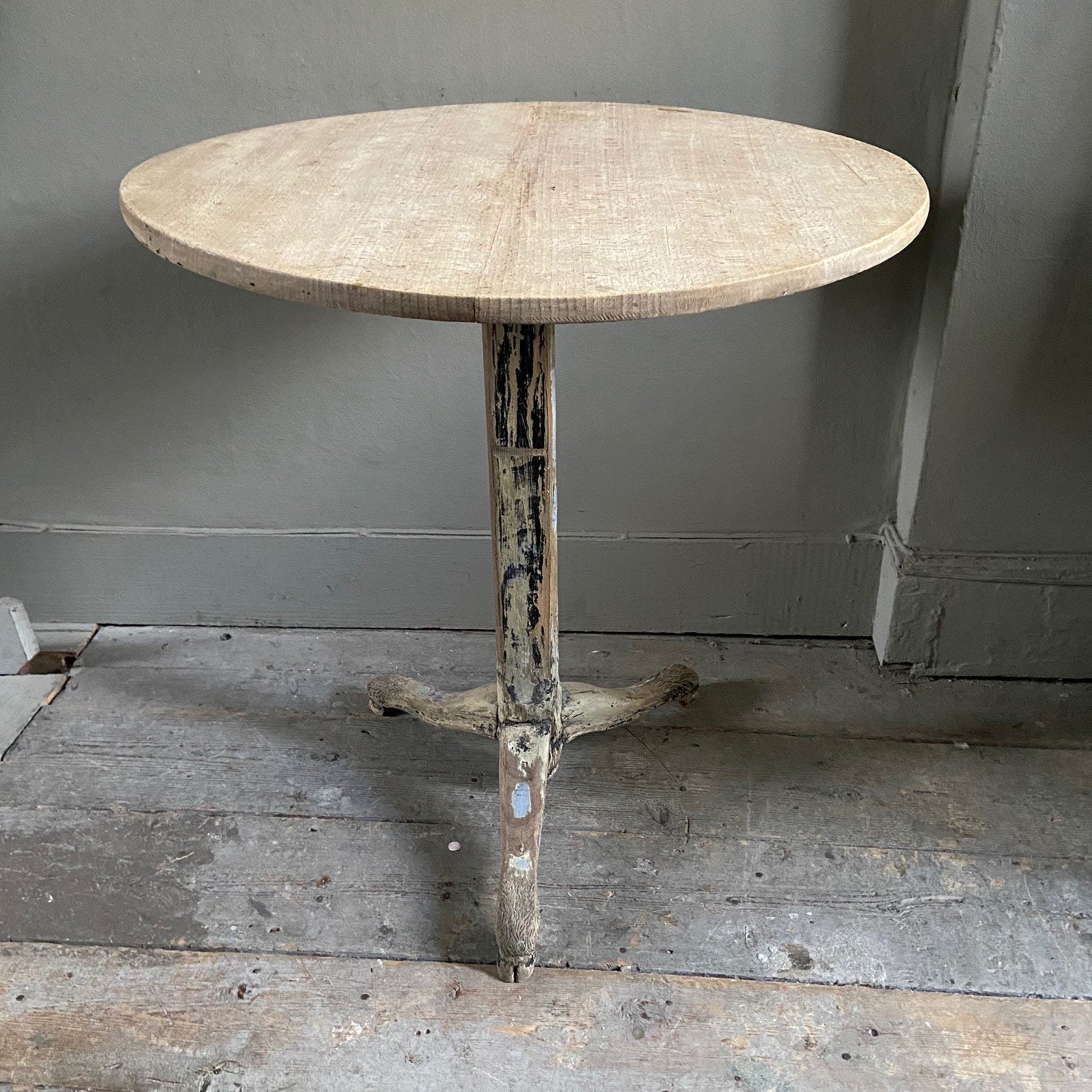 A very primitive Swedish tilt top table with a naturally bleached oval top and hand scraped tripod base revealing it's original paint.