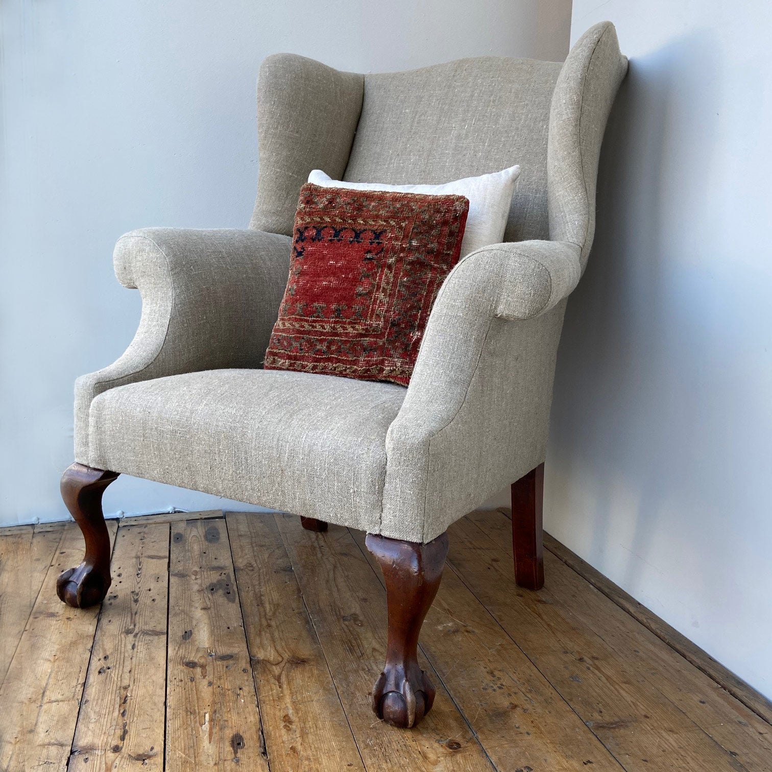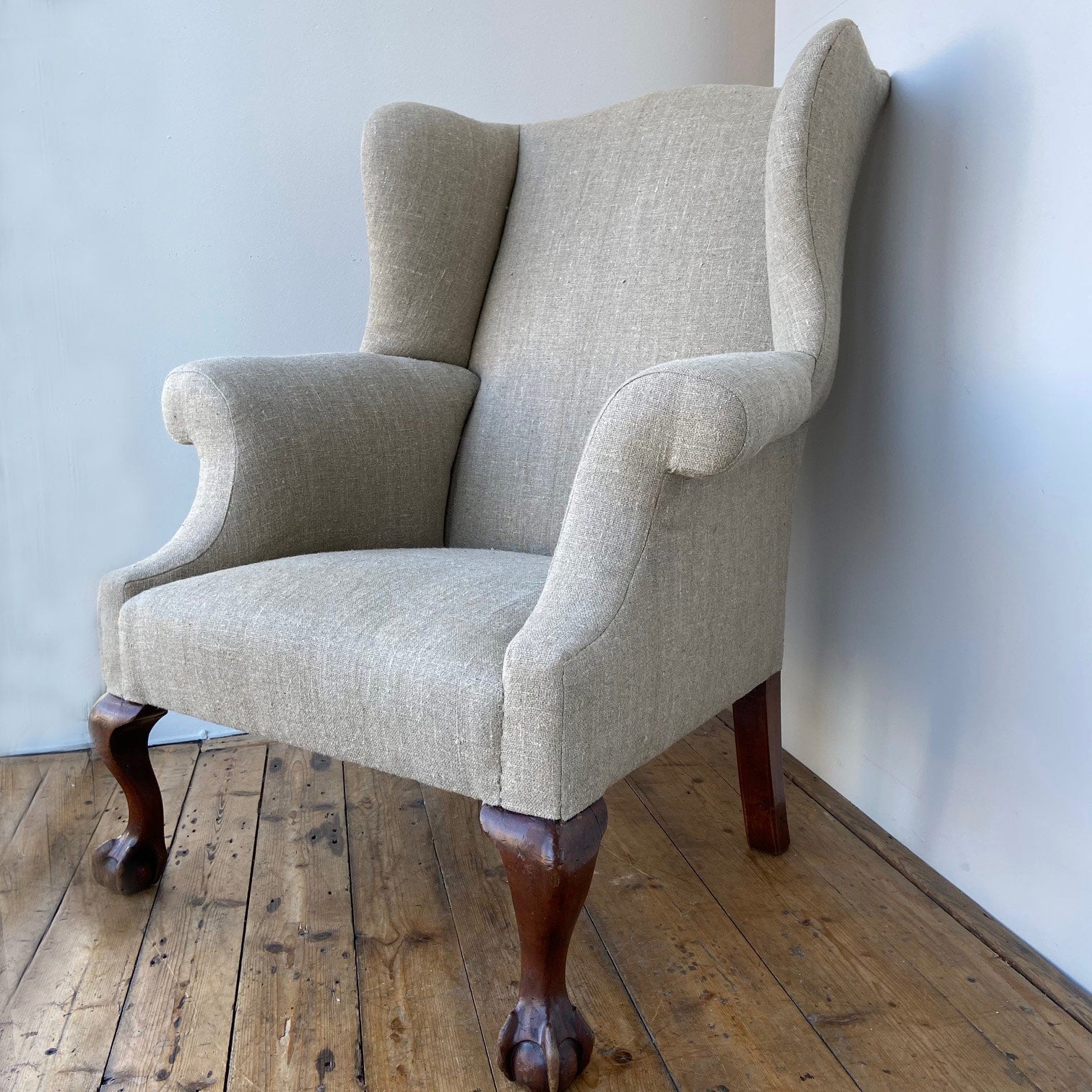 A shapely, late Victorian, wing armchair with ball and claw feet upholstered in heavy natural linen.